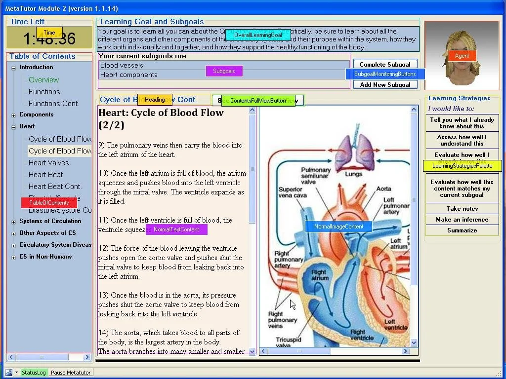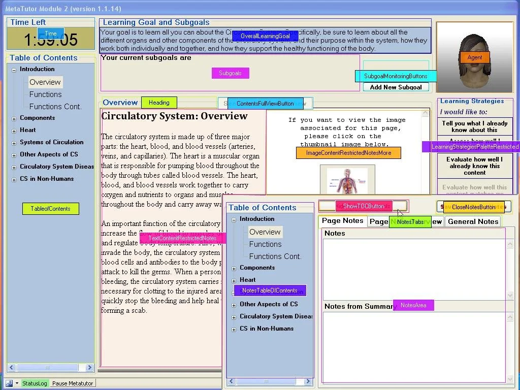 I played a key role in the design and development of MetaTutor, an intelligent tutoring system created to help students learn complex biological topics, such as the human circulatory system. The system was specifically designed to enhance students' self-regulated learning skills by providing targeted scaffolding and adaptive feedback that assisted them in utiliziing SRL processes. My responsibilities included defining educational objectives, developing content, and ensuring the system effectively supported individual learning needs. MetaTutor empowered students to better understand challenging biological concepts while building critical skills to regulate and optimize their own learning strategies.